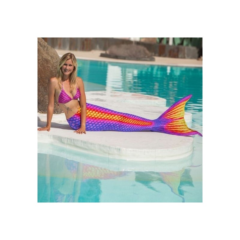 Im Super Set sind Meerjungfrauen mit wunderschönem Schuppenmuster enthalten. Die Farben schillern schön. Der Bikini besteht aus dem gleichen hochwertigen Badeanzugstoff (80% Polyamid, 20% Lycra), wie das Meerjungfraun Kostüm und ist bei 30 Grad in der Waschmaschine oder per Hand waschbar.