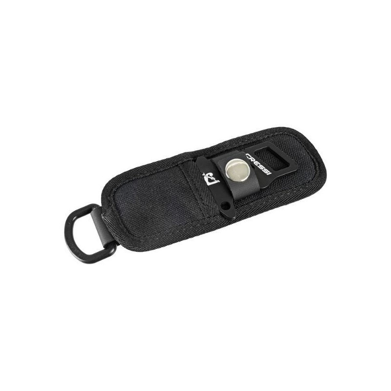 - eine Hülle aus ballistischem Nylon 1000 D; Die Scheide verfügt oben über einen robusten thermoplastischen D-Ring zur Befestigung an einem Karabiner und auf der Rückseite über Schlaufen zur Befestigung an einem Gürtel