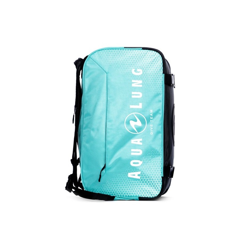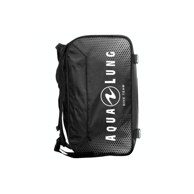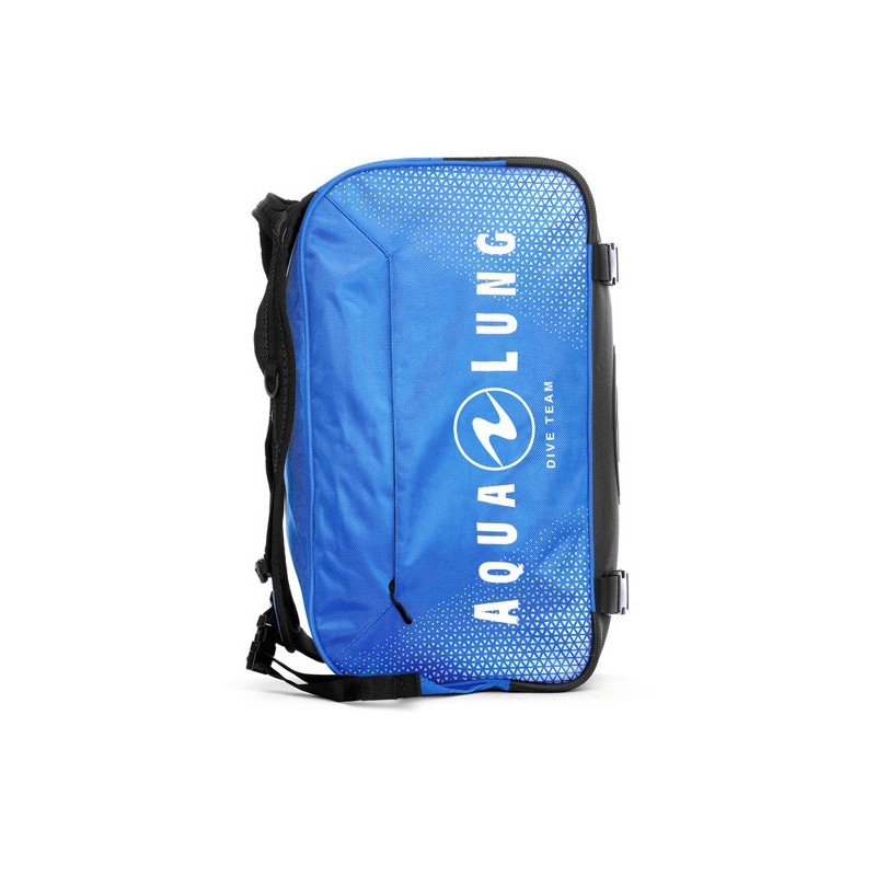Der Aqualung Explorer II Duffle Rucksack hat Handgepäckmasse, verstaubare Rucksackträger, die auch als Tagegriffe fungieren, eine Netztasche für feuchte Ausrüstung an der einen Seite und ein Organizer-Fach an der anderen Seite
