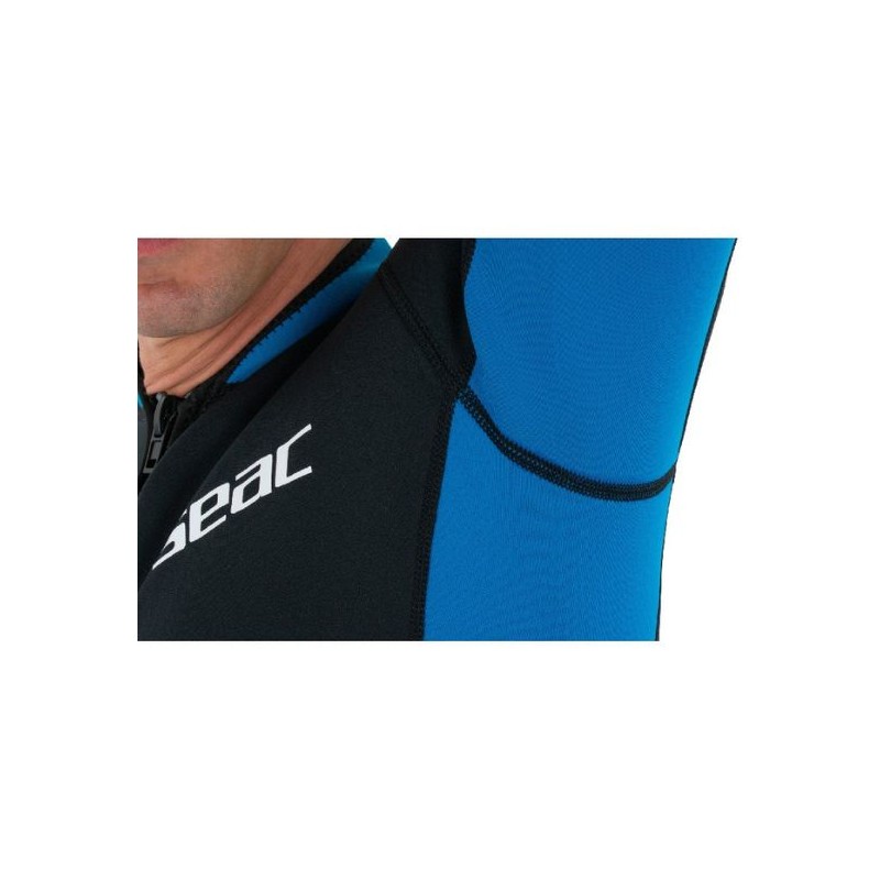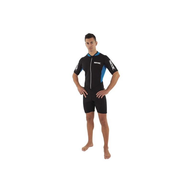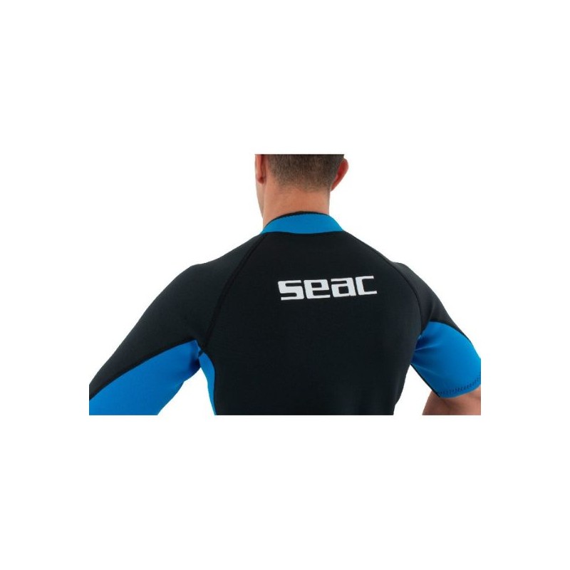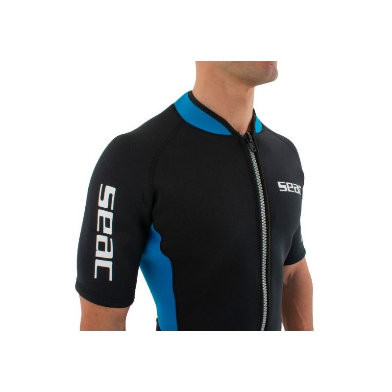 Der Seac Look Shorty Neoprenanzug besteht aus 2,5 mm doppelt gefüttertem Neopren, hat einen Frontreissverschluss entlang des Rumpfes mit einem Inneneinsatz, um das Eindringen zu reduzieren, und Flachnähte, um ein Scheuern zu verhindern