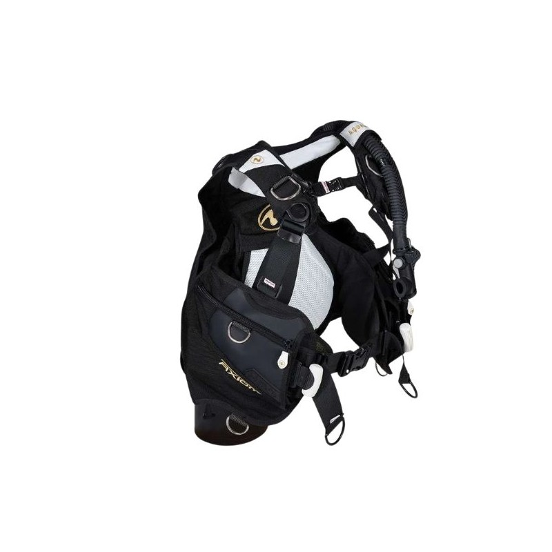Die Aqualung Axiom-Weste für Damen mit ihrem innovativen Auftriebsmechanismus verfügt über einen Wrapture-Innenharnisch, der Sie festhält und aufrecht hält, indem er das Gewicht der Flasche verteilt