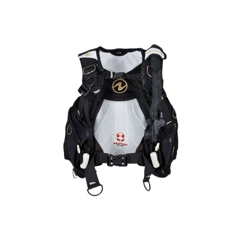 Wrapture-Gurtzeug™: Die patentierten, drehbaren Schulterschnallen und die ultradünne Rückenplatte bieten unübertroffenen Komfort und verhindern, dass das BCD-Jacket an der Oberfläche hochrutscht. Ausserhalb des Wassers ermöglicht das System ein aufrechtes Stehen, indem die Flasche nahe am Schwerpunkt gehalten und das Gewicht auf die Hüften verlagert wird