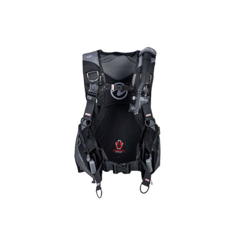 Wrapture-Gurtzeug™: Die patentierten, drehbaren Schulterschnallen und die ultradünne Rückenplatte bieten unübertroffenen Komfort und verhindern, dass das BCD-Jacket an der Oberfläche hochrutscht. Ausserhalb des Wassers ermöglicht das System ein aufrechtes Stehen, indem die Flasche nahe am Schwerpunkt gehalten und das Gewicht auf die Hüften verlagert wird