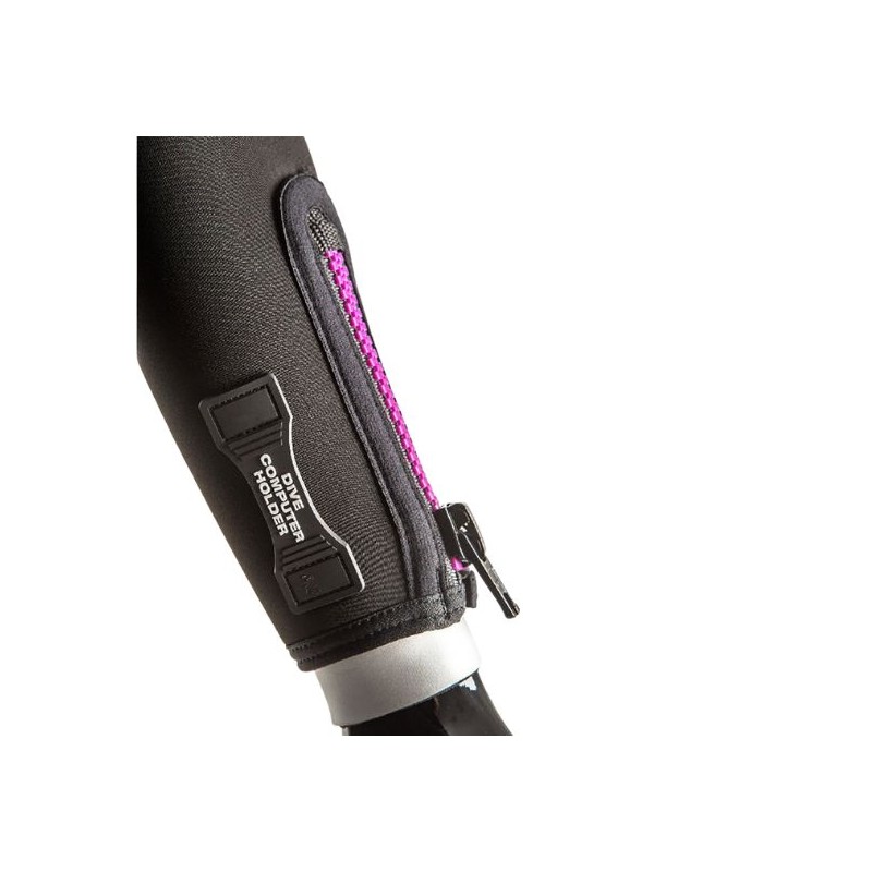 Ein Gummi-Knopflocheinsatz wurde am linken Handgelenk positioniert, um den Gürtel Ihres Tauchcomputers fest zu halten