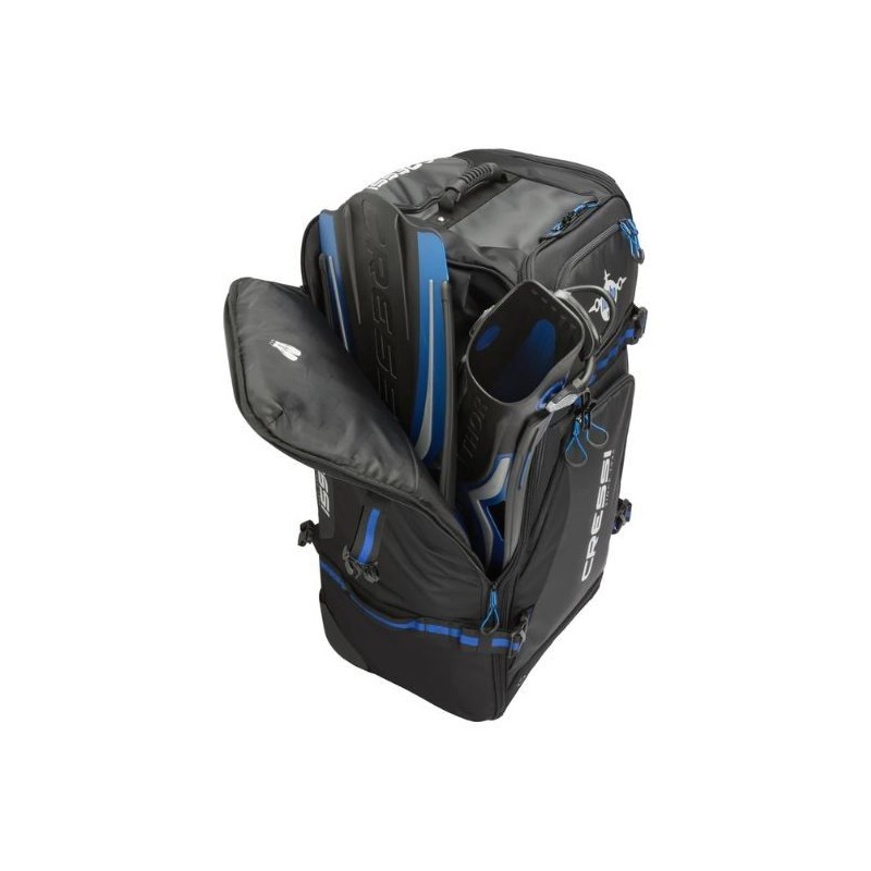 Das geräumige Innenfach ermöglicht die Organisation der gesamten technischen Ausrüstung bis zur Grösse XXL (z. B. 7-mm-Haubenanzug, Weste, Stiefel, Handschuhe, Maske, Atemregler usw.), die mit zwei vorgesehenen Riemen befestigt werden kann
