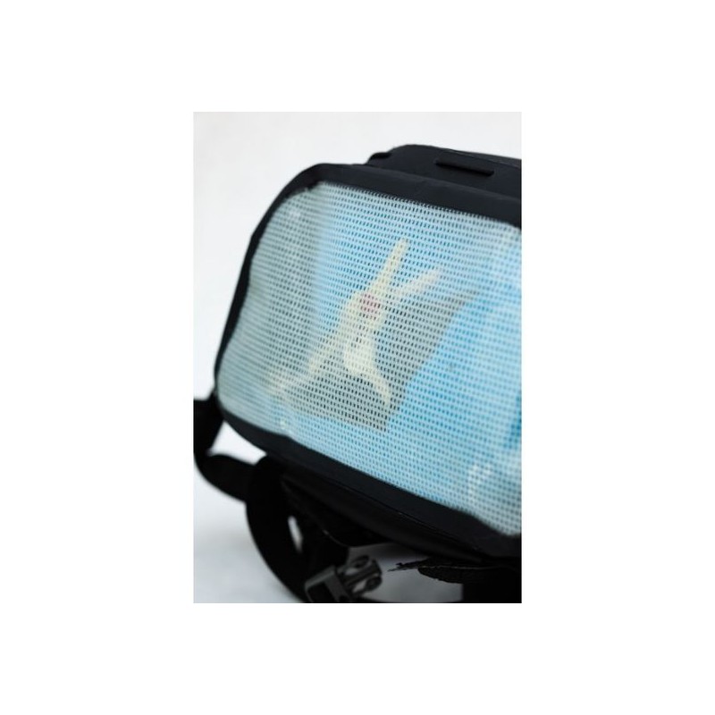 Hauptfach, um Ihre Sachen trocken zu halten, Fronttasche, transparenter Boden für bessere Sichtbarkeit im Inneren der Tasche, Trillerpfeife am Brustgurt, Befestigungspunkt für ein hinteres Nachtlicht, Riemen zur Befestigung eines Paddel