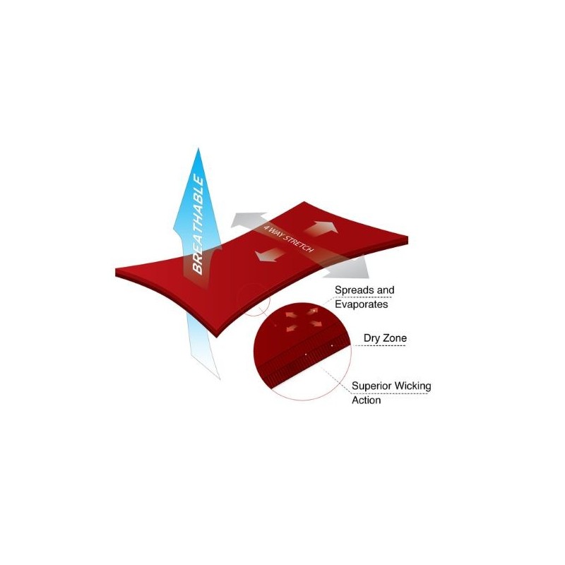 Das fortschrittliche dehnbare und atmungsaktive Gewebe leitet Feuchtigkeit vom Körper weg, um eine trockene Zone zu schaffen, während die Feuchtigkeit über eine größere Fläche verteilt wird, um schnell zu verdampfen