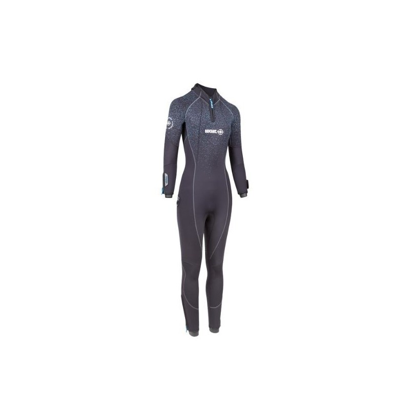 Grand Zip dorsal « G-Lock plus » (monopièce col) avec curseur métal et sous-patte au profil embossé Water Dam System pour une étanchéité accrue (brevet Beuchat) Zip poignet et cheville Renforcement du néoprène à l'extrémité de tous les Zips pour éviter tout risque de déchirure si le plongeur force en tirant sur les curseurs