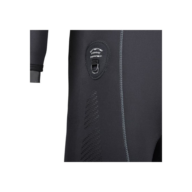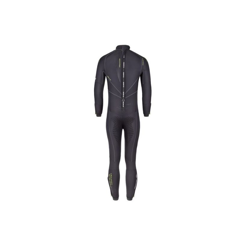 Grand Zip dorsal « G-Lock plus » (monopièce col) avec curseur métal et sous-patte au profil embossé Water Dam System pour une étanchéité accrue (brevet Beuchat) Zip poignet et cheville Renforcement du néoprène à l'extrémité de tous les Zips pour éviter tout risque de déchirure si le plongeur force en tirant sur les curseurs