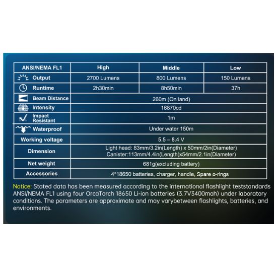 La lampe utilise 4 piles 18650 et offre une puissance maximale de 2700 lumens, ce qui en fait un outil très utile pour répondre à vos besoins sous-marins