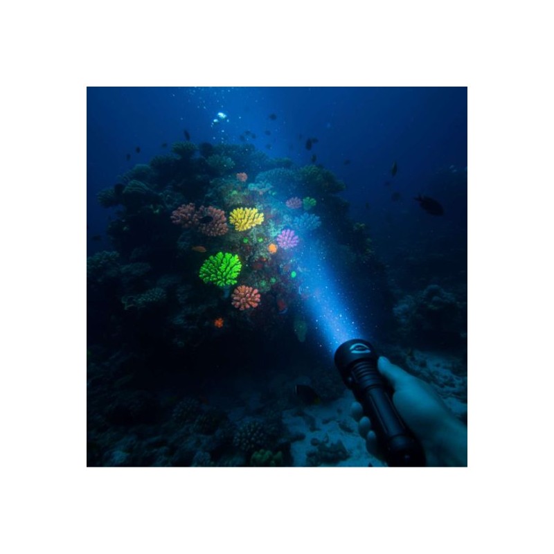 Avec une longueur d'onde de 465 nm, elle est idéale pour découvrir la fluorescence lors de plongées nocturnes (fluo-diving)