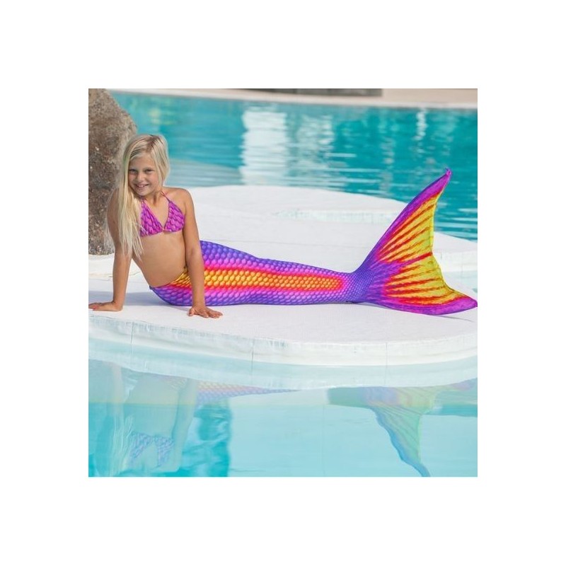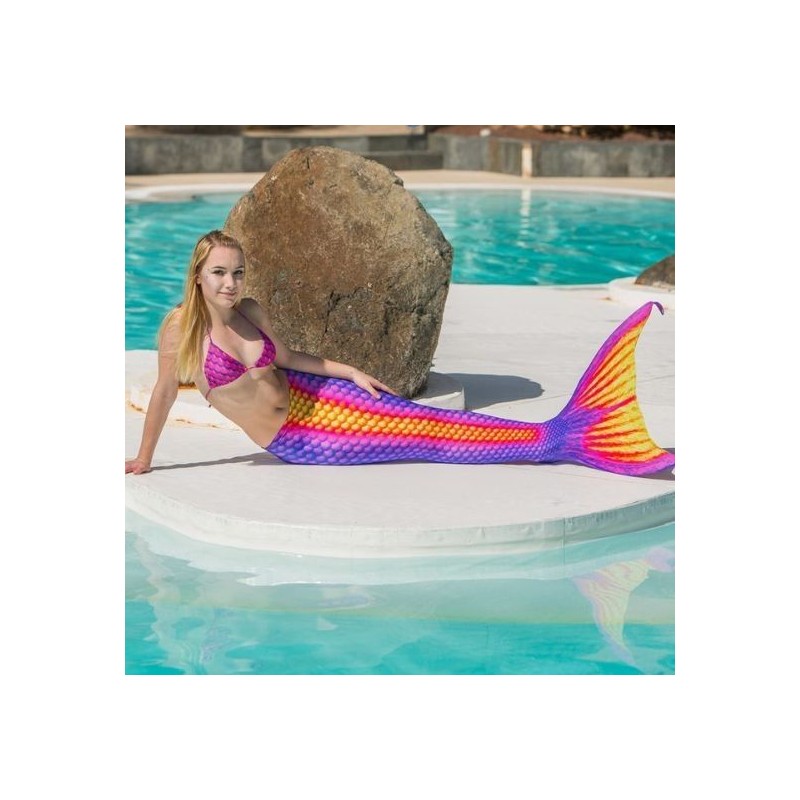 L'ensemble super comprend le même motif que le costume mis à l'échelle. Les couleurs brillent joliment. Le bikini se composent du même matériau de maillot de bain de haute qualité (80% polyamide, 20% lycra) que le costume de sirène et peuvt être lavés à 30 degrés dans la machine à laver ou à la main. La taille du bikini peut être choisie indépendamment. Le set de nageoire de sirène peut également être commandé sans l'ensemble bikini.
