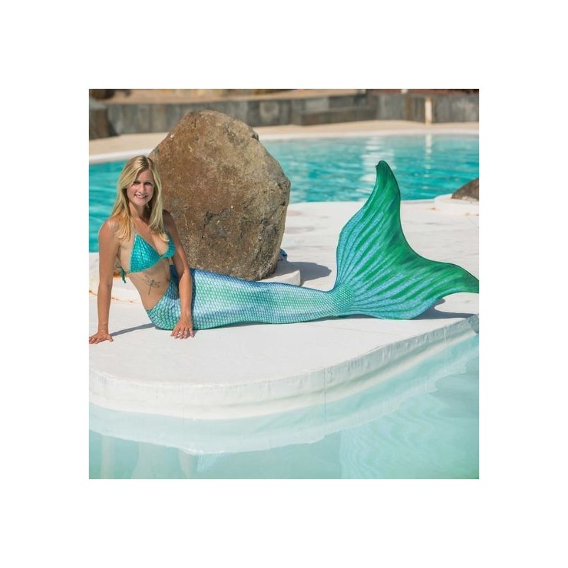 L'ensemble pro comprend le même motif que le costume mis à l'échelle. Les couleurs brillent joliment. Le bikini se compose du même matériau de maillot de bain de haute qualité (80% polyamide, 20% lycra) que le costume de sirène et peut être lavés à 30 degrés dans la machine à laver ou à la main. La taille du bikini peut être choisie indépendamment. Le set de nageoire de sirène peut également être commandé sans l'ensemble bikini.