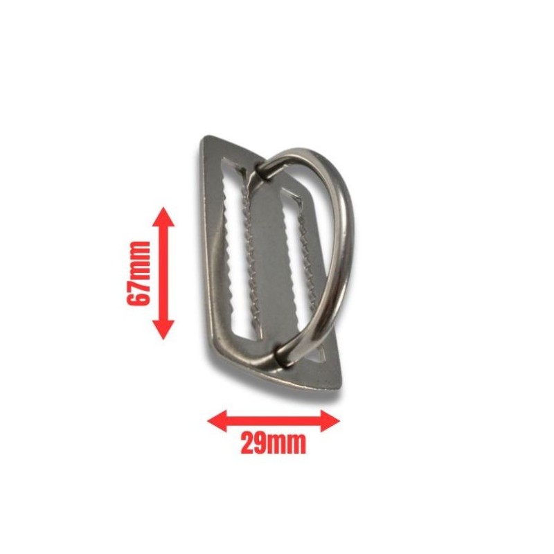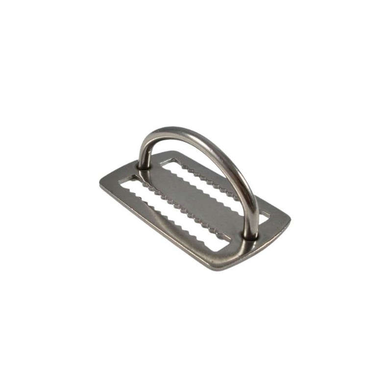 Anneau D-Ring en inox dentelé formant un angle de 90° pour un montage facile sur des sangles nylon et facilitant l'accroche d'accessoires