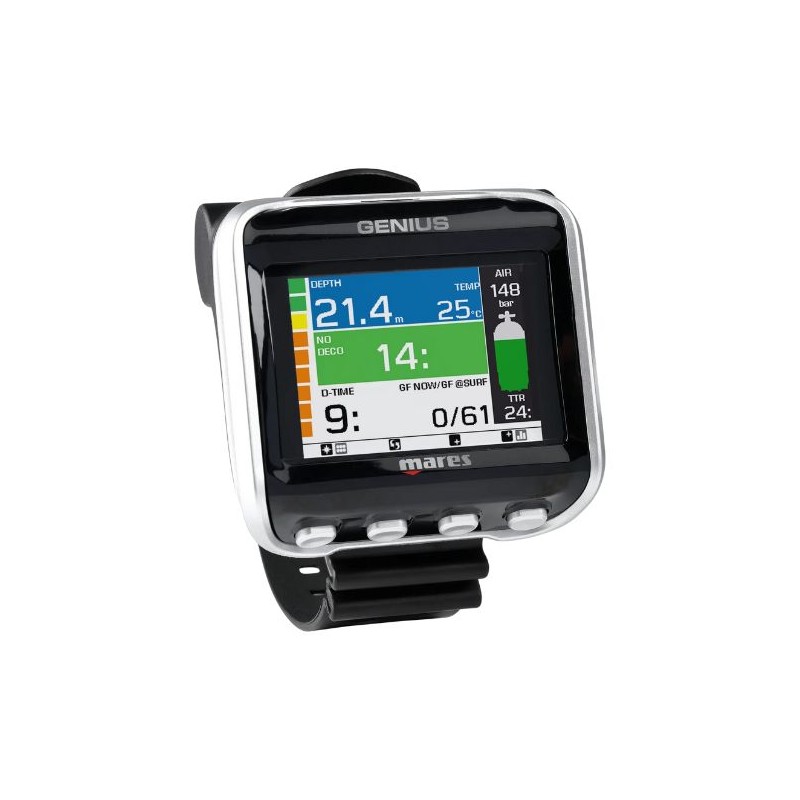 L'ordinateur Mares Genius est idéal pour les plongeurs techniques qui utilisent des mélanges Trimix et Nitrox avec de multiples changements et qui souhaitent optimiser les temps de décompression et de plongée en fonction de l'alimentation en gaz