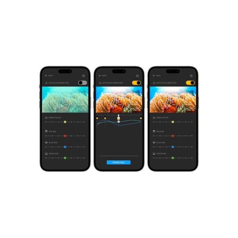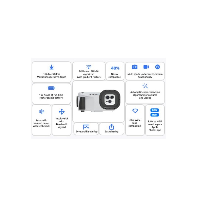 En ce qui concerne les photos, la combinaison iPhone, Oceanic+ Dive Housing et Oceanic+ App offre toutes les fonctions photo et vidéo avancées disponibles avec la génération d'iPhone utilisée, ainsi qu'une série de filtres de couleur numériques et une correction automatique du point blanc pour le réglage de la profondeur. La fonction d'objectif ultra grand angle de l'iPhone reste également disponible.
