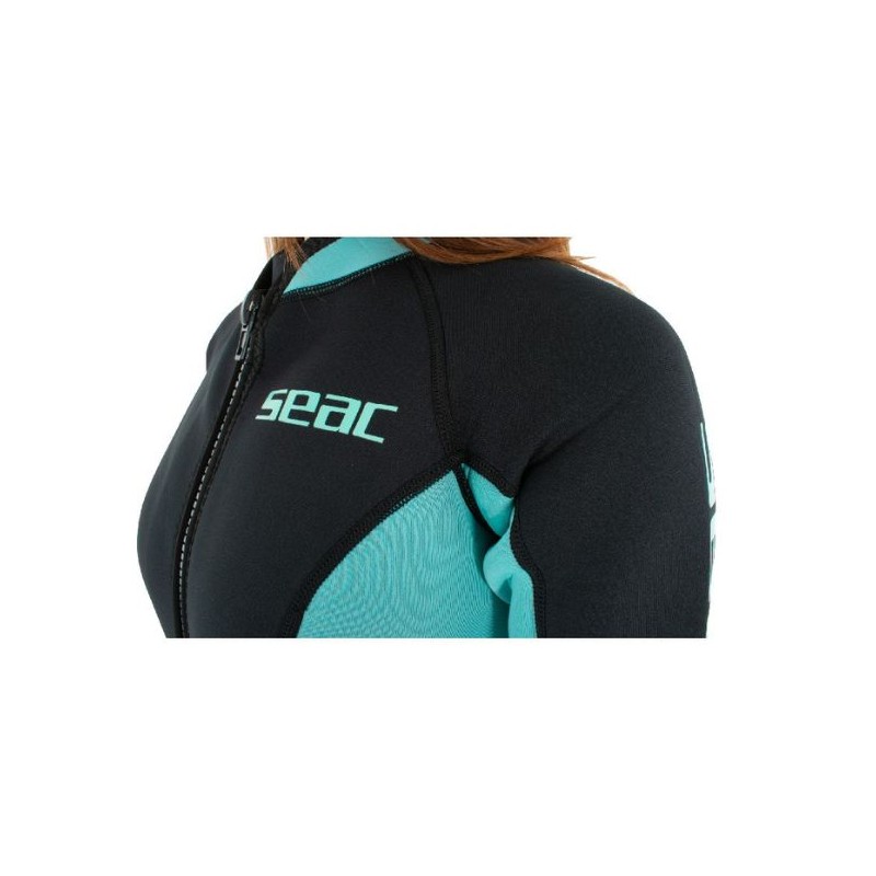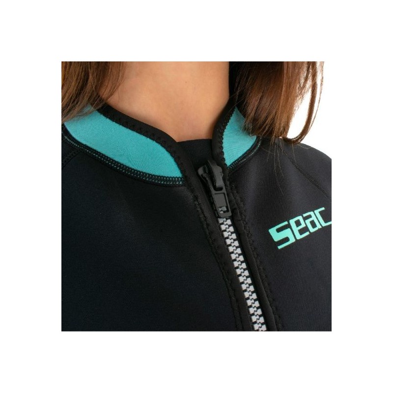 Le shorty Seac Look 2,5 mm, à double doublure, possède une fermeture éclair frontale sur tout le torse avec un panneau intérieur pour réduire les infiltrations et des coutures plates pour éviter les frottements